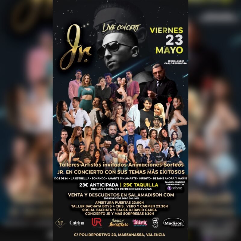 JR, el talentoso artista de bachata radicado en Nueva York, llega por primera vez a nuestra sala y por primera vez en Valencia, para deleitarnos con sus éxitos más aclamados, como “Amarte Sin Amarte”, “Desnúdate”, “La Estrella” , “X Amada” y “Dos de mi”. Su estilo único y apasionado promete una noche inolvidable llena de ritmo y emoción.