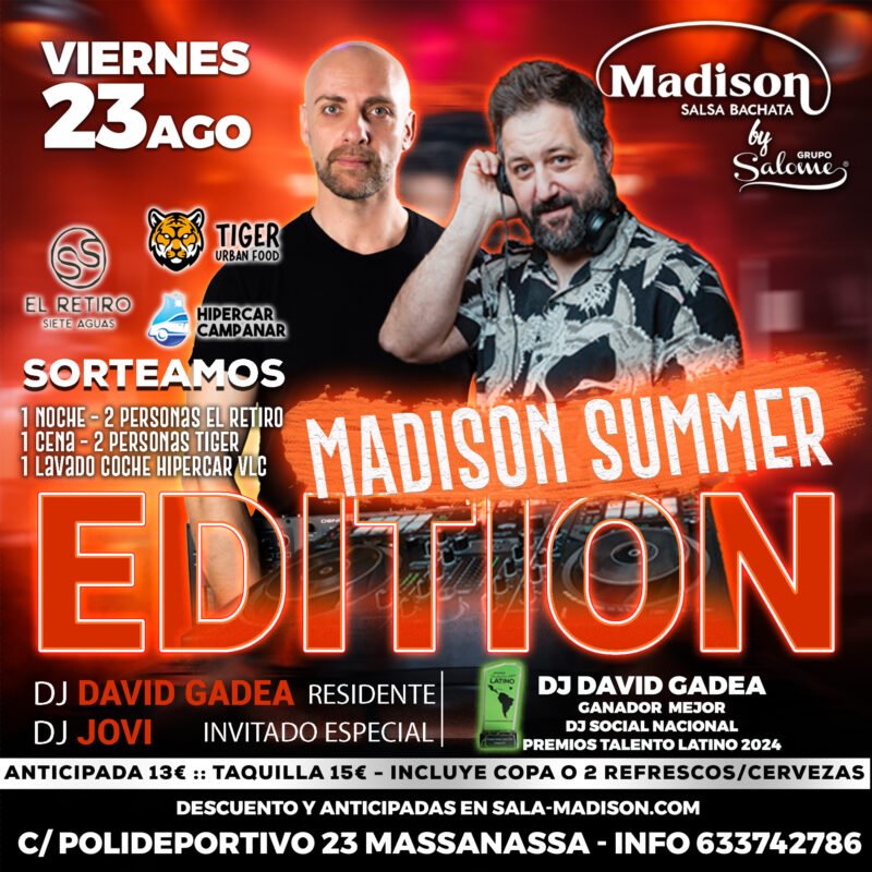 🎉 Viernes 23 de agosto desde las 23:15h, Madison Salsa Bachata by Grupo Salome te trae la Madison Summer Edition. Prepárate para una noche inolvidable con David Gadea 🏆, el mejor DJ social del país, y el increíble DJ Jovi 🎧. ¡Una sesión épica de Salsa y Bachata para que no pares de bailar! 💃🕺