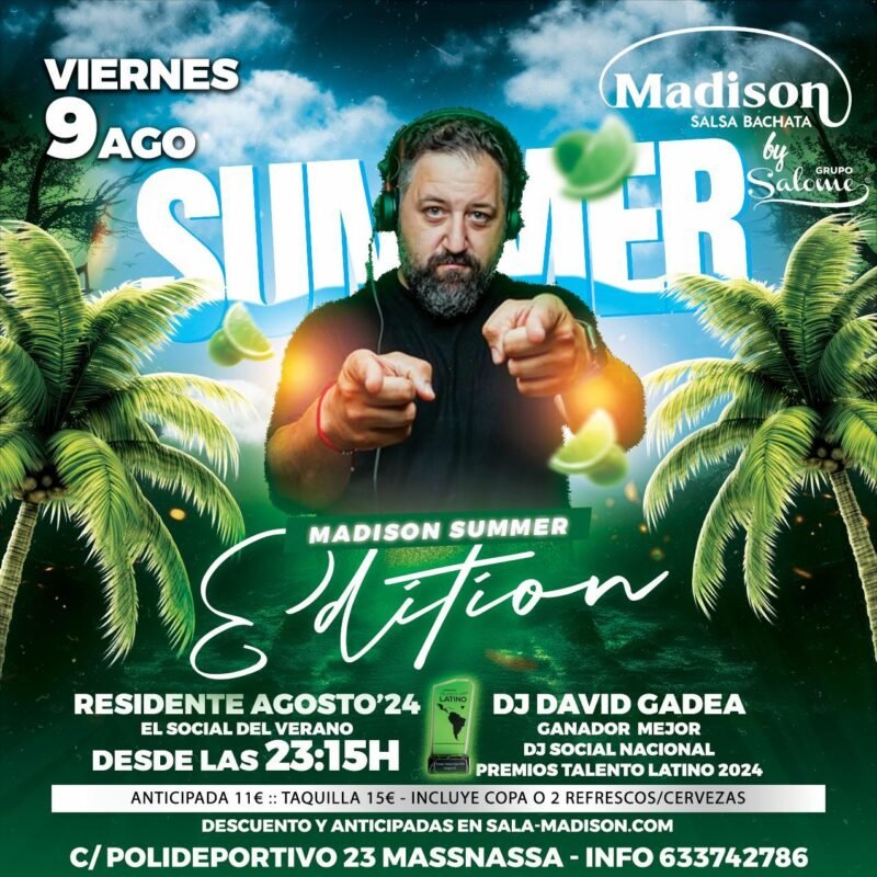¡🌟 Madison Summer Edition 🌟 te ofrece una noche épica con David Gadea, el DJ ganador del Premio Talento Latino a Mejor DJ Social, ¡poniendo a todos a bailar con los mejores ritmos de Salsa y Bachata! 🏆🎶