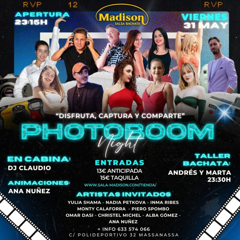 📸✨ ¡Prepárate para una noche llena de diversión y fotos inolvidables en la fiesta Photoboom Night de Madison Salsa Bachata! 🎉📱